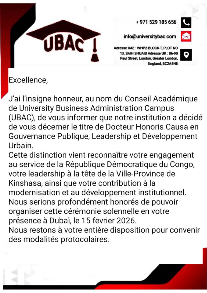 Une nouvelle consécration internationale vient s’ajouter au parcours du sénateur Gentiny Ngobila Mbaka, après la distinction reçue récemment à Dubaï. Cette fois-ci, University Business Administration Campus, également basée à Dubaï, a choisi de lui décerner un Doctorat Honoris Causa, marquant une nouvelle reconnaissance de son engagement et de son leadership dans la gouvernance.