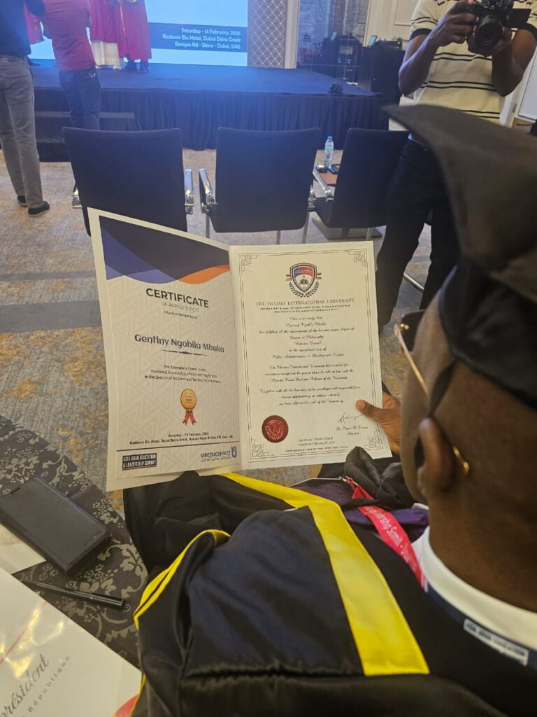 Ce 14 février 2026, à Dubaï, The Thames International University a décerné un Doctorat Honoris Causa au sénateur Gentiny Ngobila Mbaka, ancien gouverneur de la ville de Kinshasa.